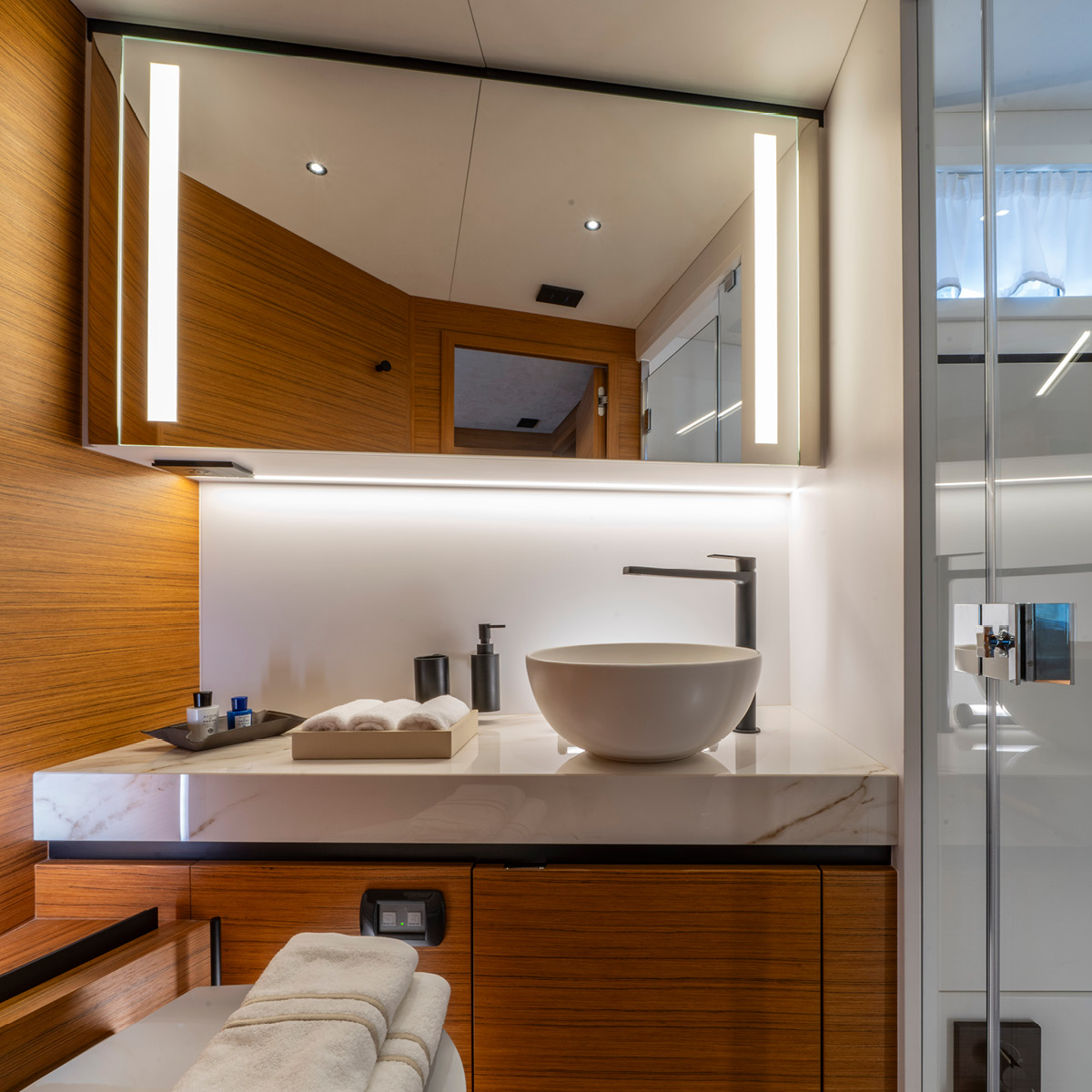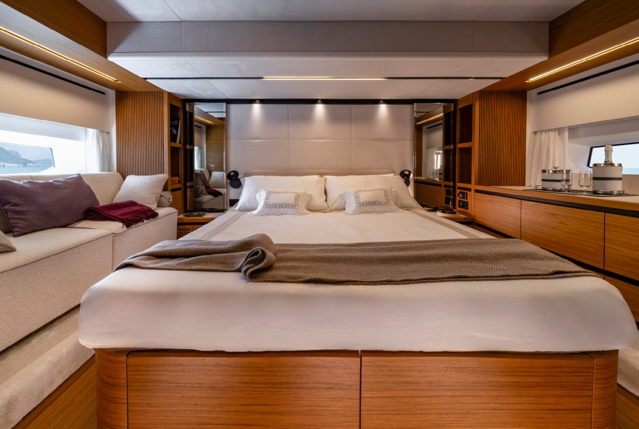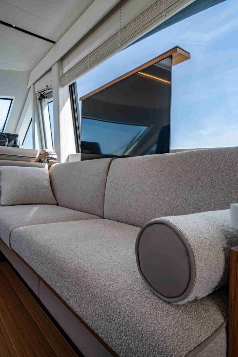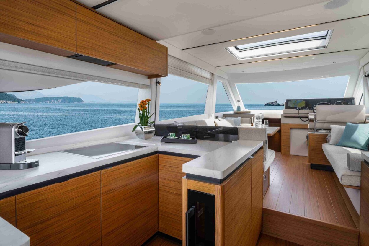 La navegabilidad es, como siempre, la prioridad para Solaris Power, y el astillero ha invertido recursos significativos en el rendimiento en el mar. La espaciosa dinette del 60 Coupé está equipada con todas las comodidades. Además del techo abatible, las dos ventanas laterales y la puerta trasera son completamente practicables, transformando la dinette en un espacio que se siente casi como al aire libre. Una puerta lateral cerca del puesto de mando facilita la comunicación con el muelle durante las maniobras en el puerto. Una cocina en forma de L, funcional y totalmente equipada, junto a la mesa de comedor exterior, hace que el servicio sea cómodo y eficiente. Se puede añadir un baño para disponer de esta utilidad también en la cubierta principal.