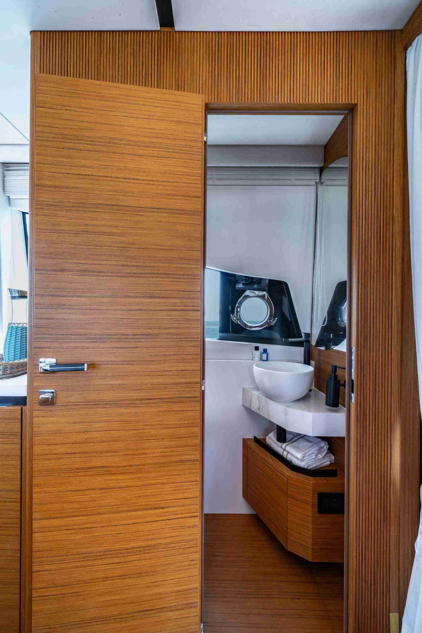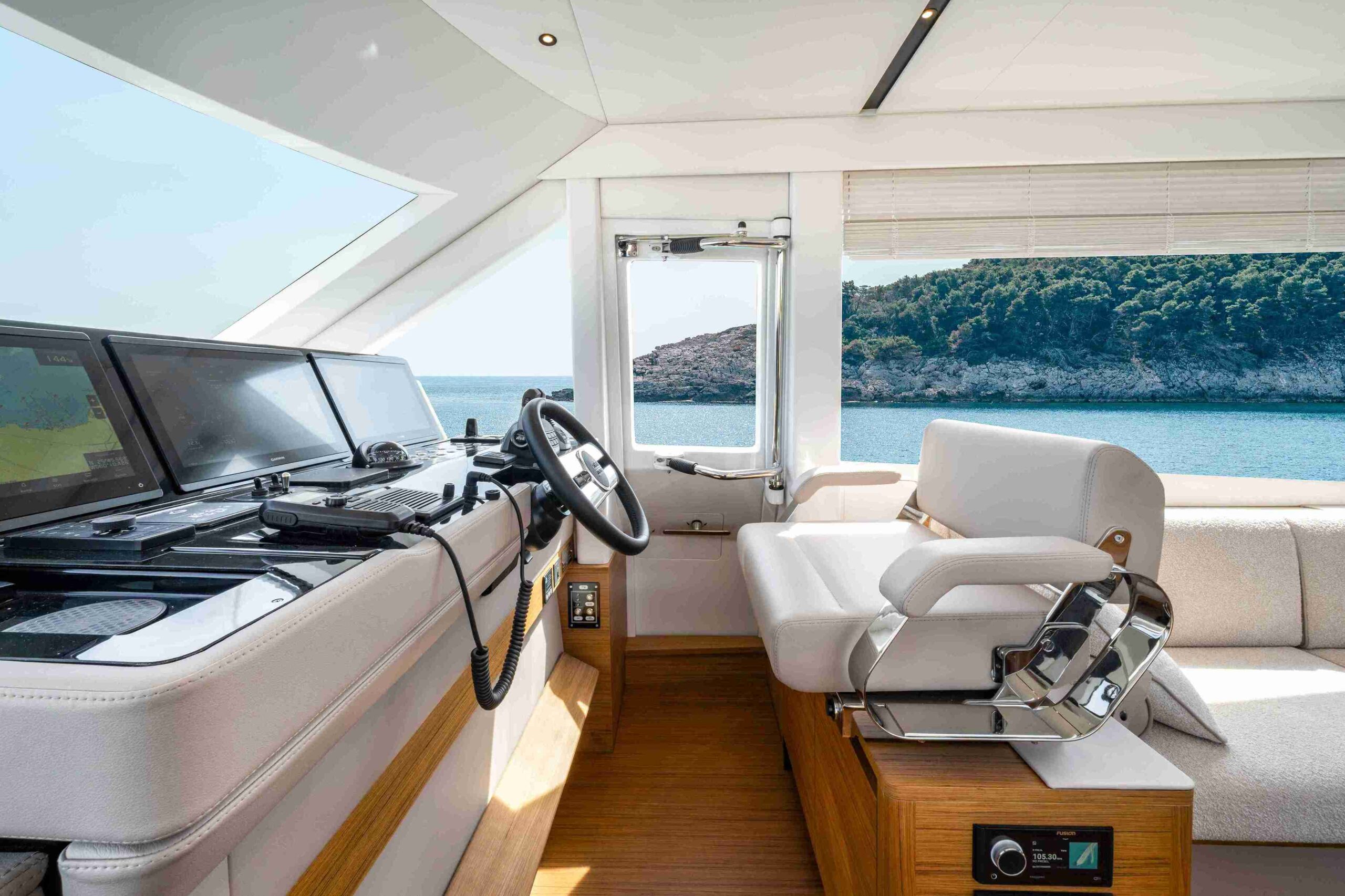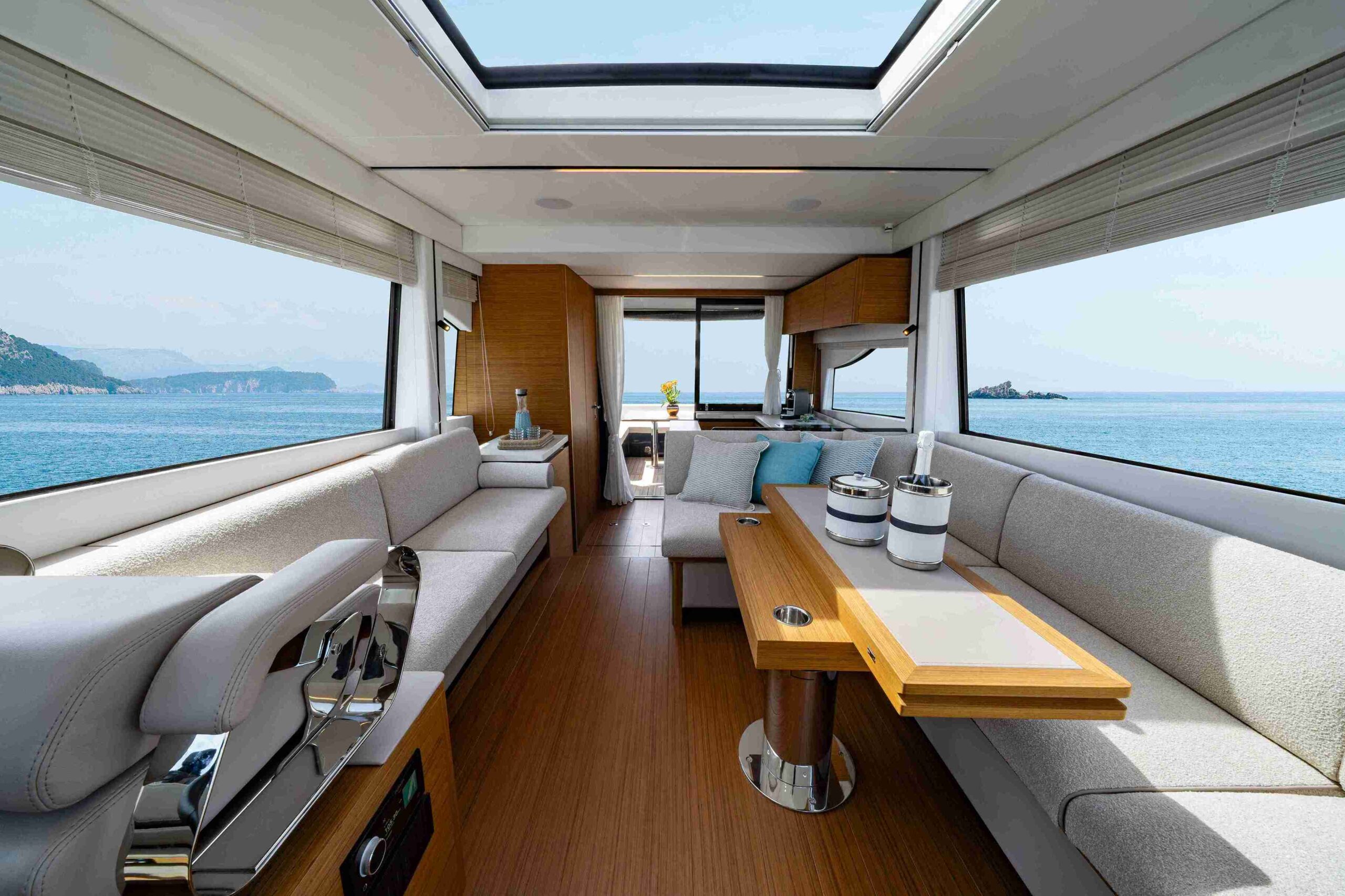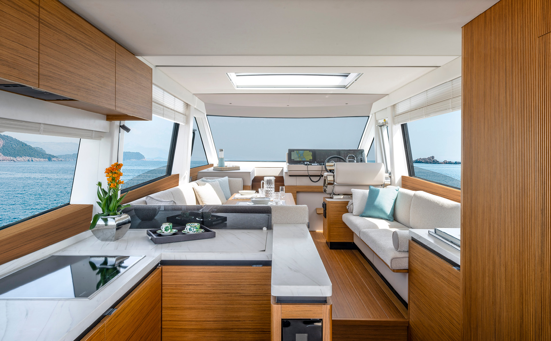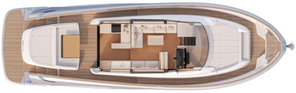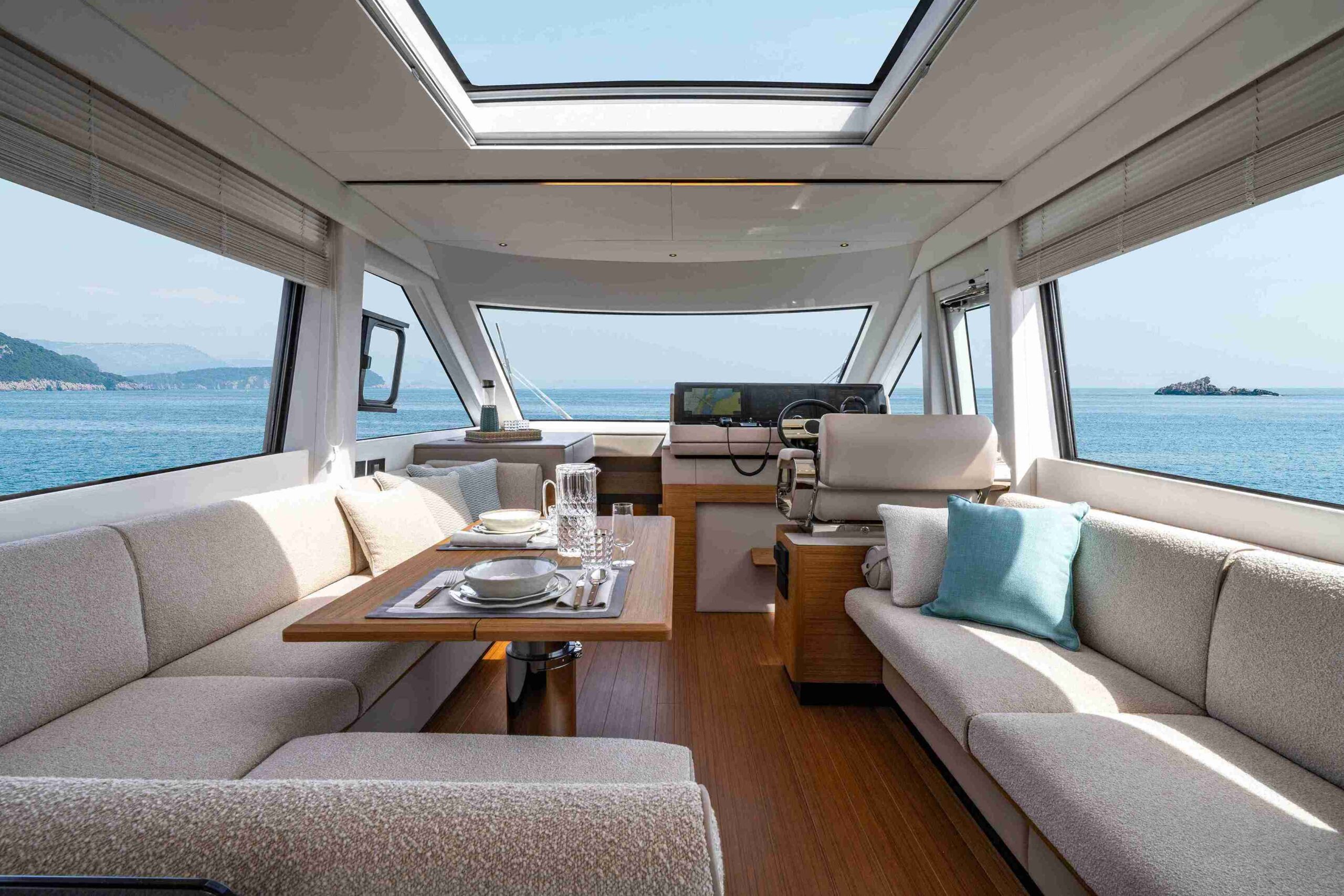 La navegabilidad es, como siempre, la prioridad para Solaris Power, y el astillero ha invertido recursos significativos en el rendimiento en el mar. La espaciosa dinette del 60 Coupé está equipada con todas las comodidades. Además del techo abatible, las dos ventanas laterales y la puerta trasera son completamente practicables, transformando la dinette en un espacio que se siente casi como al aire libre. Una puerta lateral cerca del puesto de mando facilita la comunicación con el muelle durante las maniobras en el puerto. Una cocina en forma de L, funcional y totalmente equipada, junto a la mesa de comedor exterior, hace que el servicio sea cómodo y eficiente. Se puede añadir un baño para disponer de esta utilidad también en la cubierta principal.