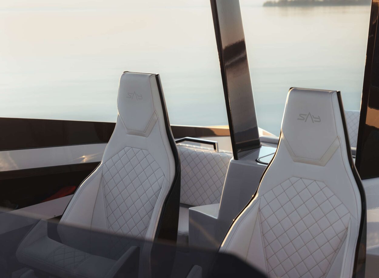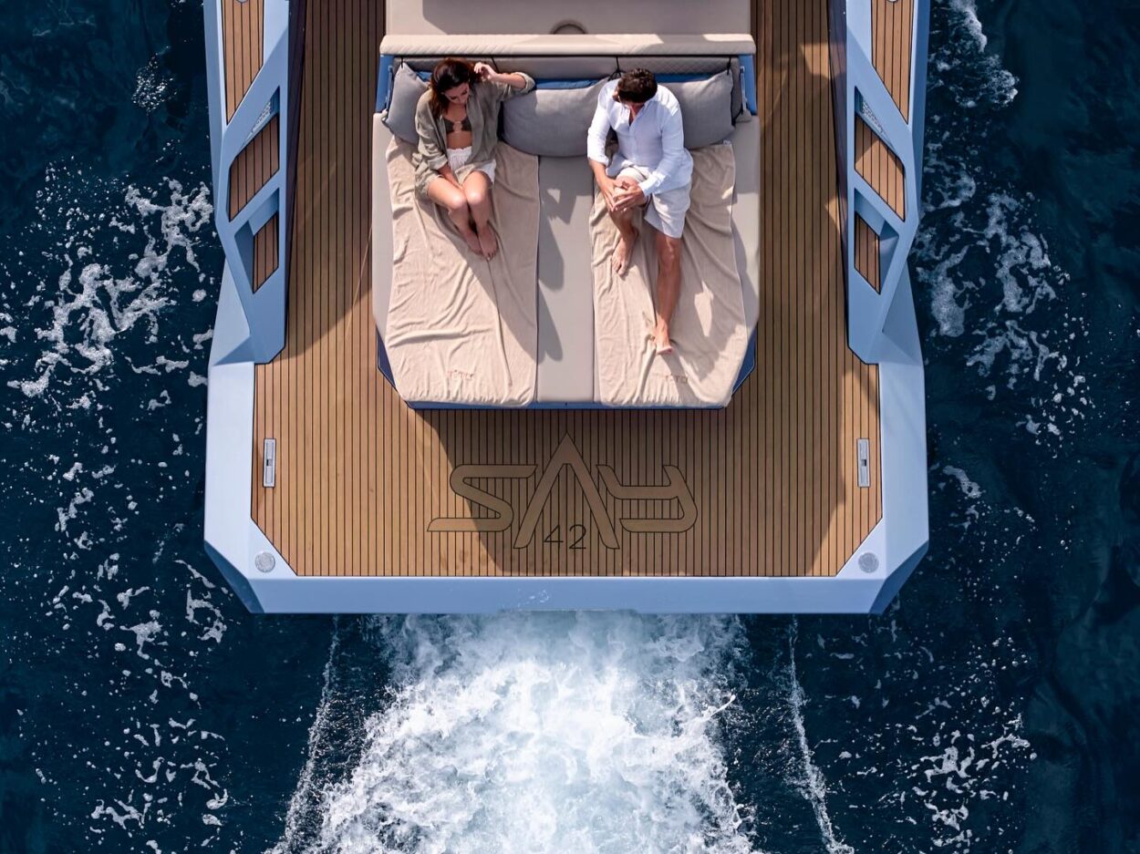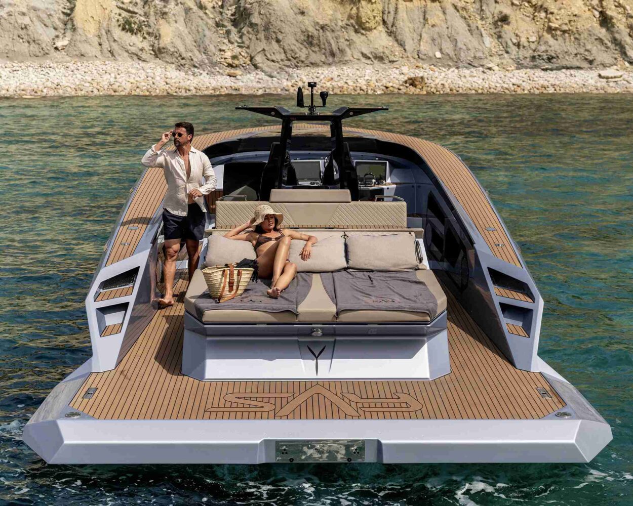 - El SAY 42 se realza con deflectores en forma de A que aumentan la comodidad al reducir la resistencia, las salpicaduras y el consumo de combustible, empujando el agua hacia atrás mientras impulsan el yate hacia adelante.