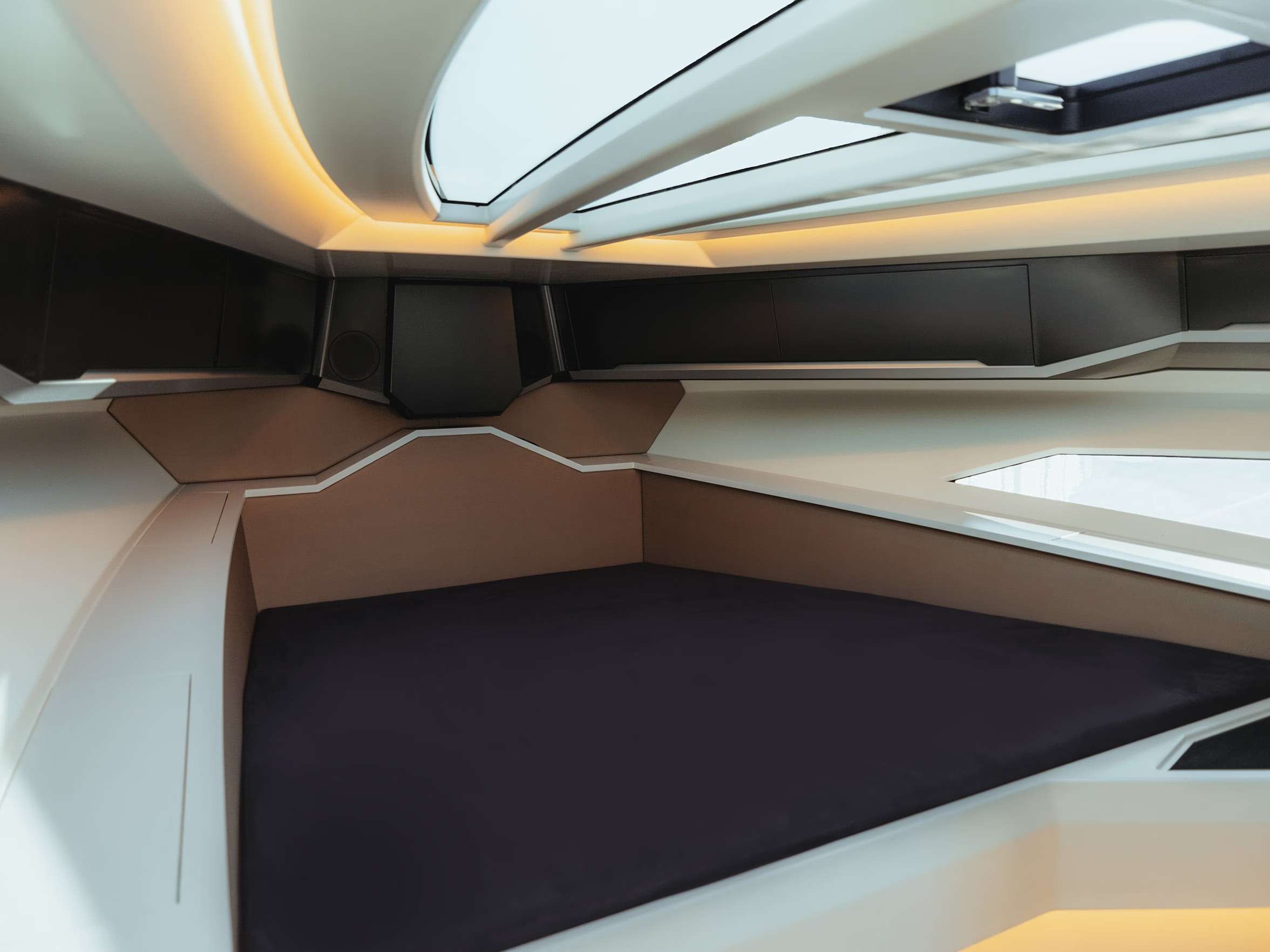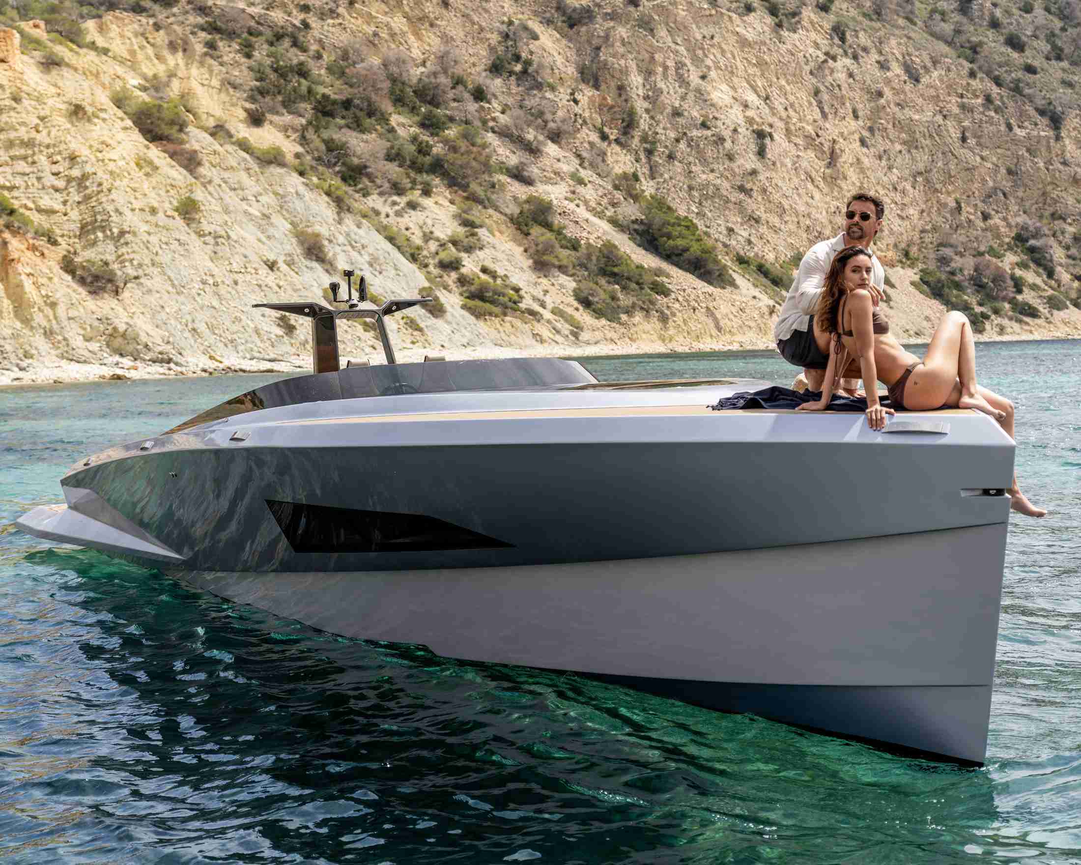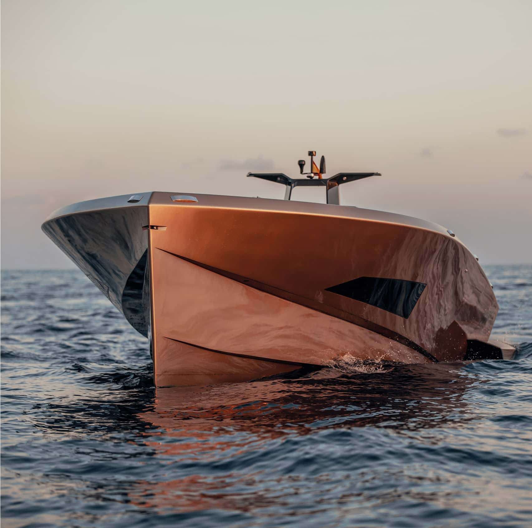 - El SAY 42 se realza con deflectores en forma de A que aumentan la comodidad al reducir la resistencia, las salpicaduras y el consumo de combustible, empujando el agua hacia atrás mientras impulsan el yate hacia adelante.