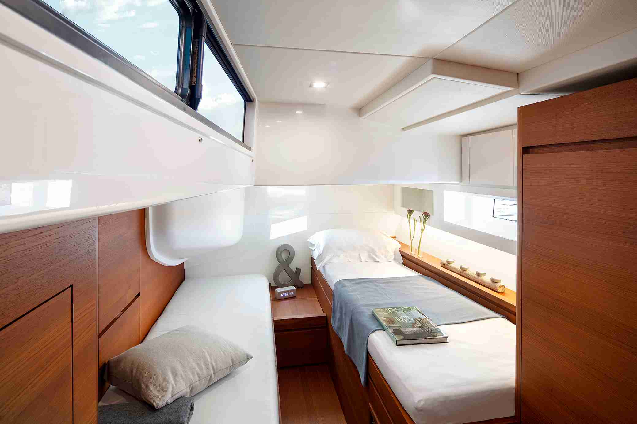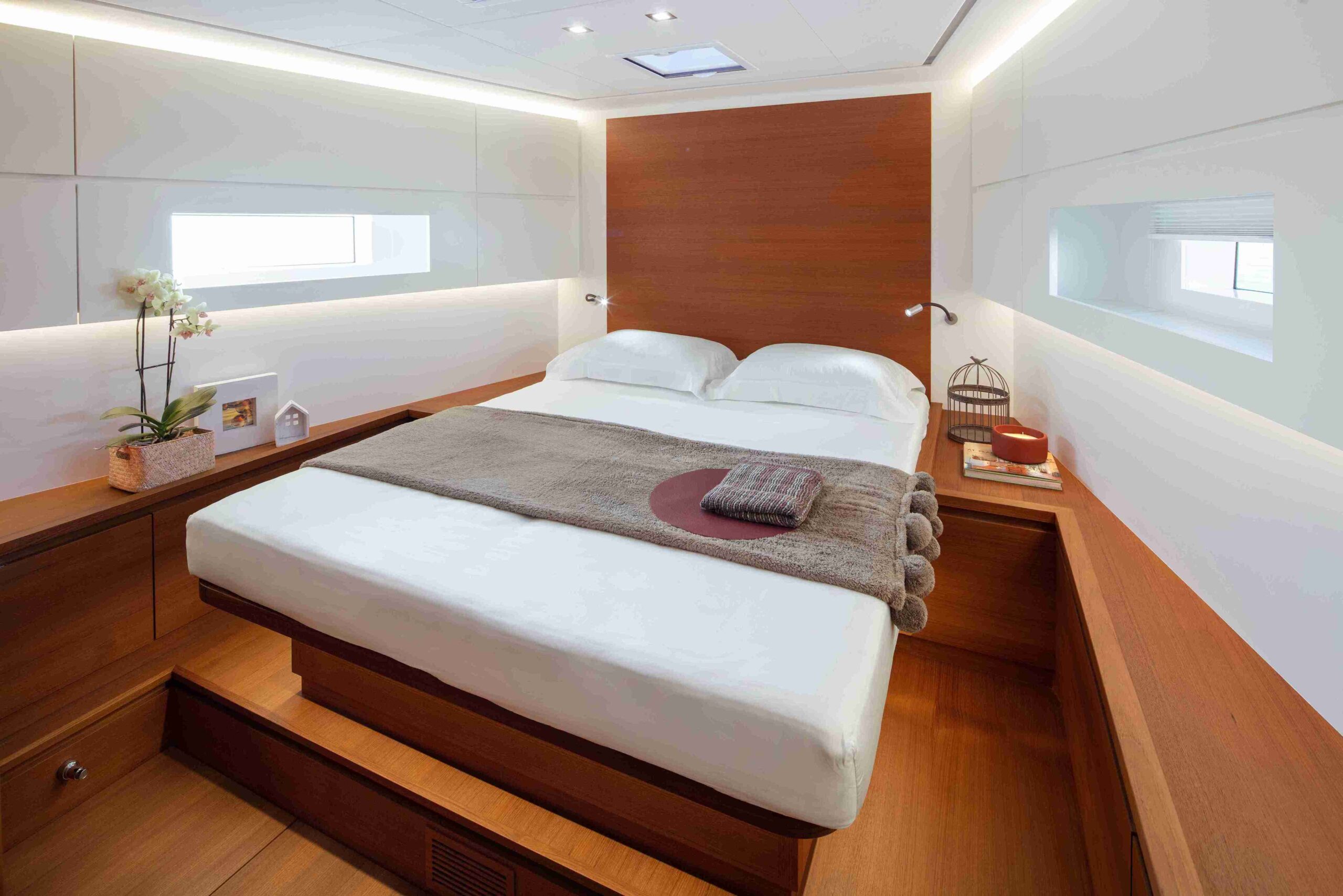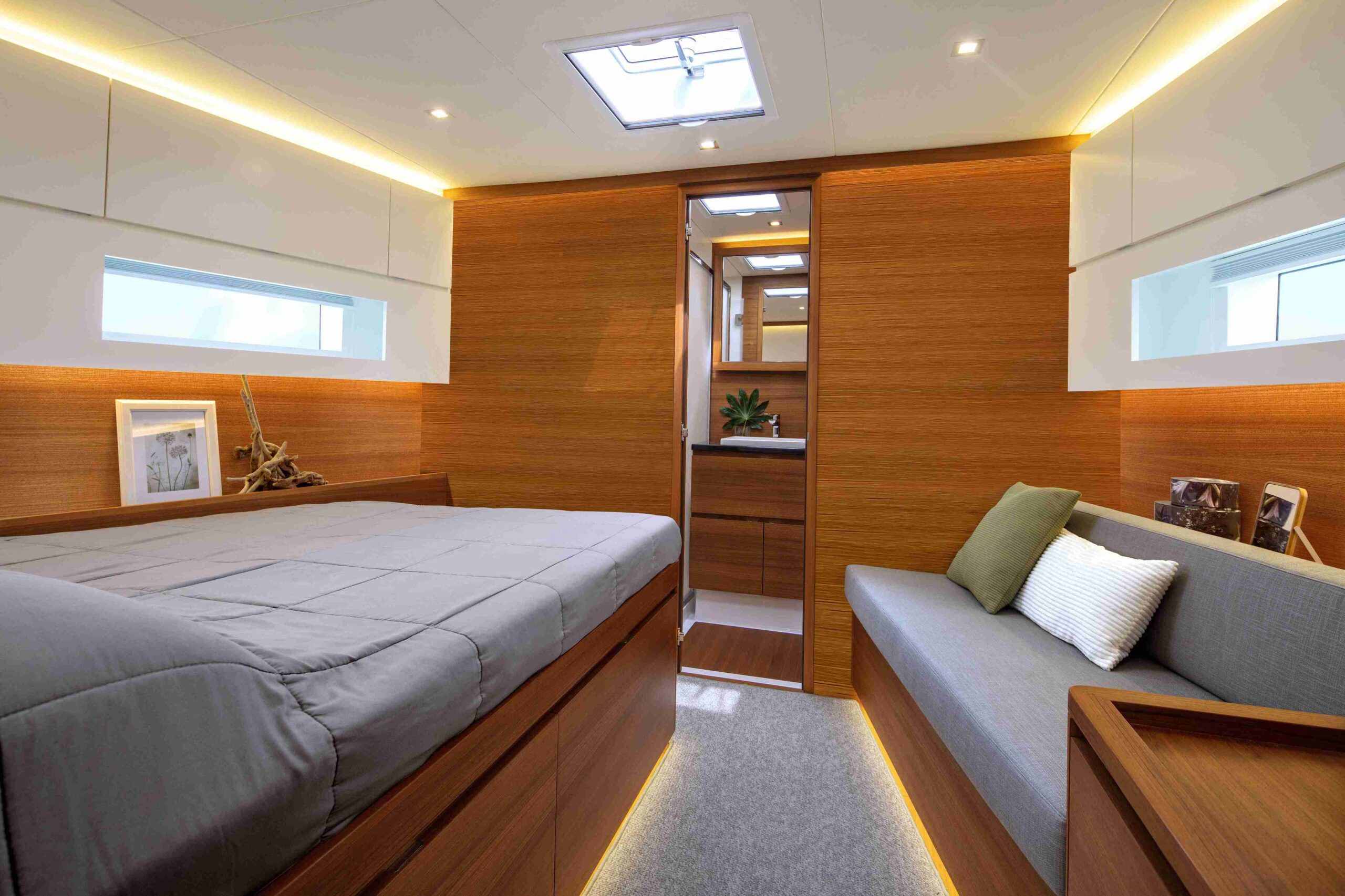 Inside, the Solaris 60 maintains the brand’s classic layout, optimizing each space to offer comfort and functionality. The kitchen is located towards the bow, slightly hidden by two steps, creating an elegant and discreet atmosphere. In the stern, two cabins configurable with single or double beds have large windows that flood the interior with natural light. The owner’s cabin, located forward, is spacious and offers center or side berth options, along with generous storage spaces. In addition, the sailor’s cabin, also in the bow, includes a separate bathroom, providing privacy and practicality.