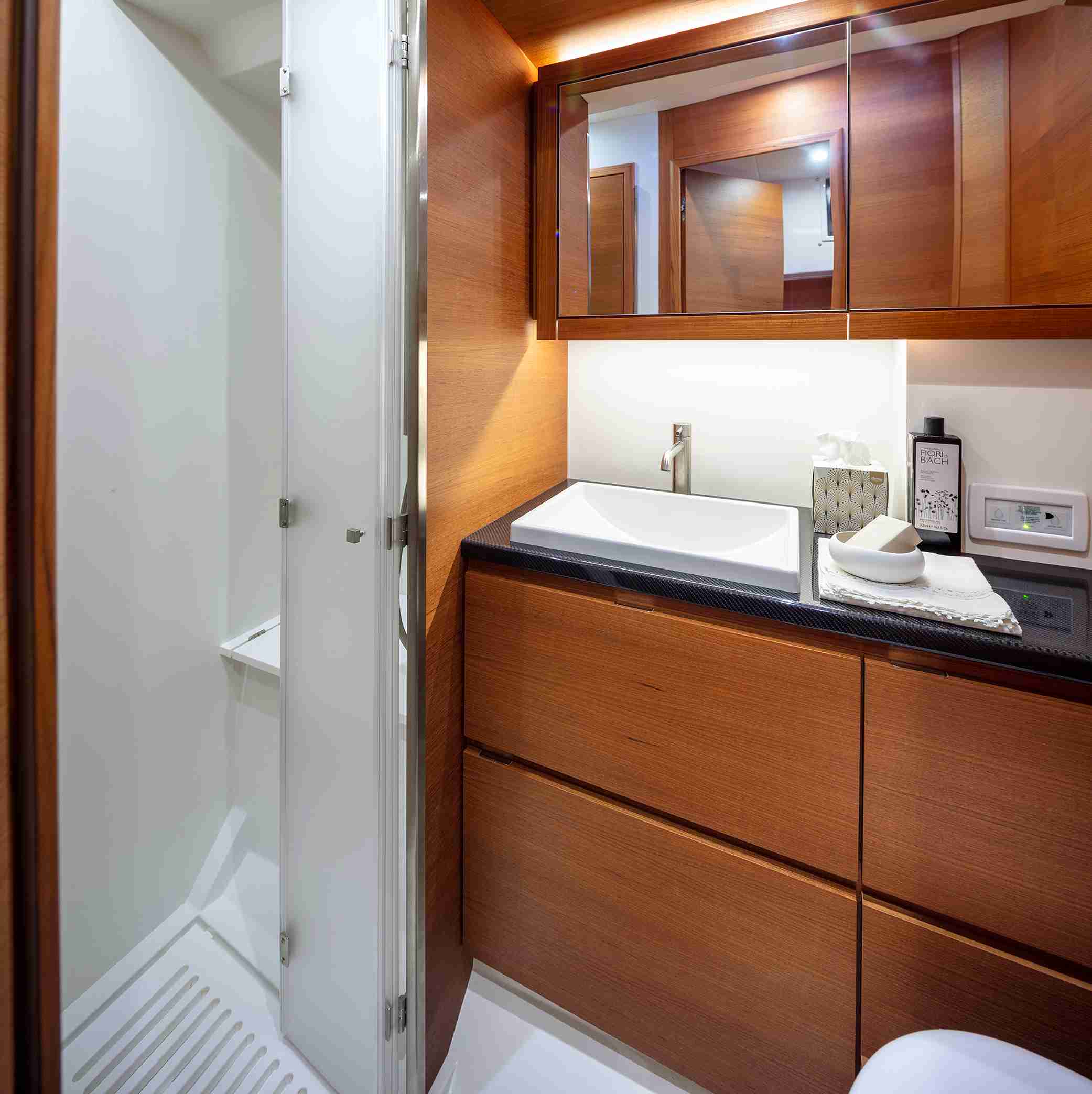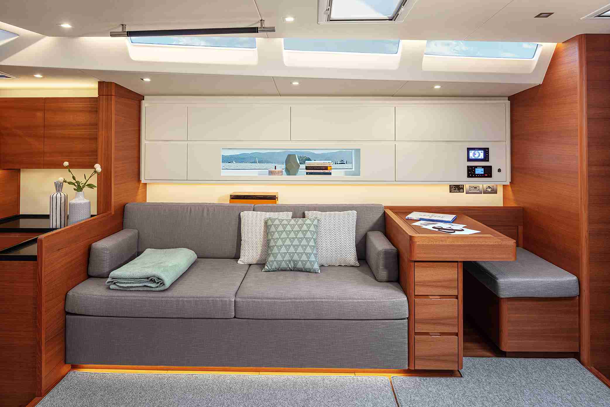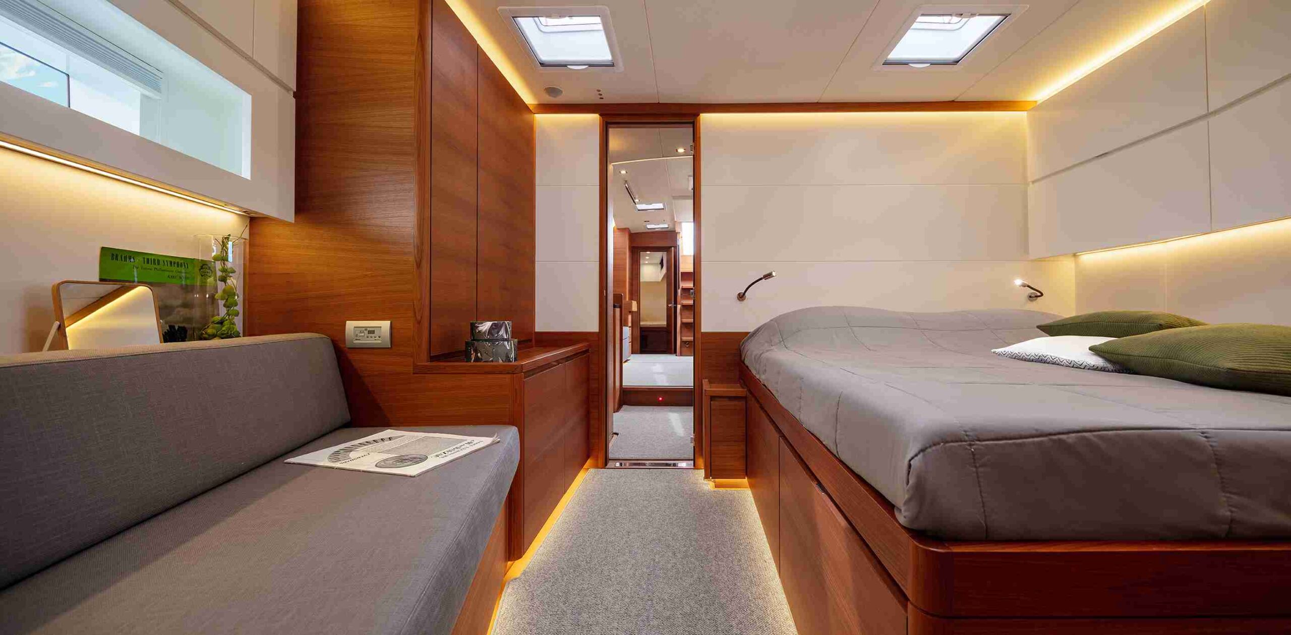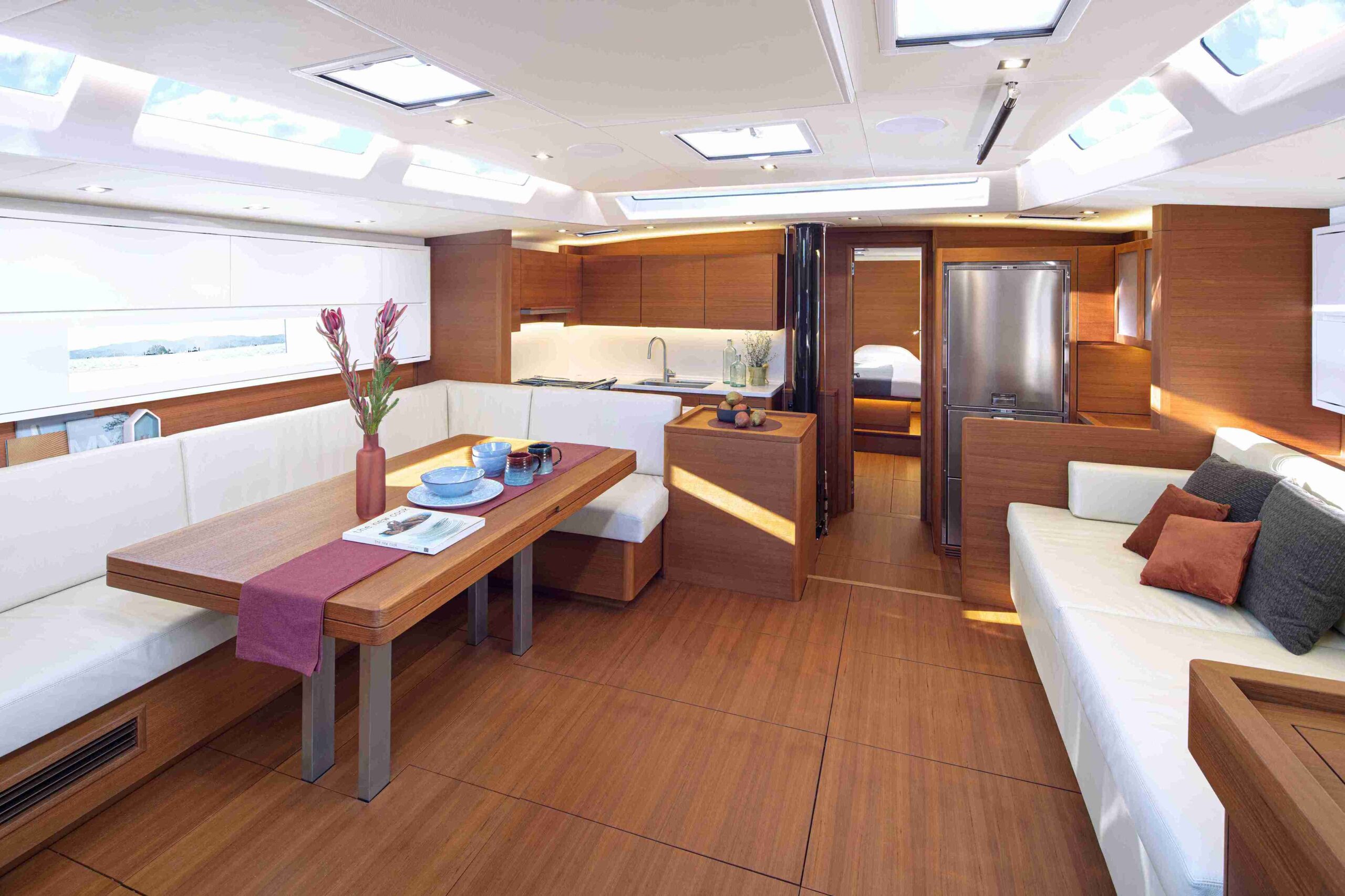 Inside, the Solaris 60 maintains the brand’s classic layout, optimizing each space to offer comfort and functionality. The kitchen is located towards the bow, slightly hidden by two steps, creating an elegant and discreet atmosphere. In the stern, two cabins configurable with single or double beds have large windows that flood the interior with natural light. The owner’s cabin, located forward, is spacious and offers center or side berth options, along with generous storage spaces. In addition, the sailor’s cabin, also in the bow, includes a separate bathroom, providing privacy and practicality.